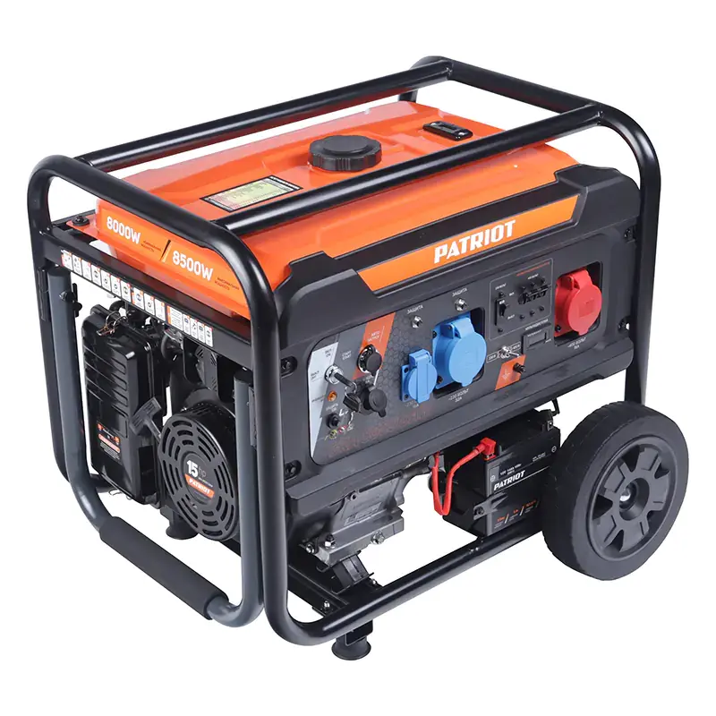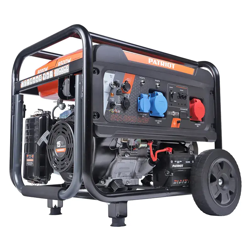 Бензиновый генератор PATRIOT GRA 8500DAW используется для резервного электроснабжения осветительных и бытовых приборов в коттедже или на даче, небольших станков и инструментов в мастерской. Номинальная мощность на выходе при выработке однофазного тока составляет 7,5 кВт, при выработке трехфазного — 8 кВт. Генератор имеет три розетки: бытовую 230 В/16 А и силовые 230 В/32 А, 400 В/16 А, а также выход постоянного тока 12 В.