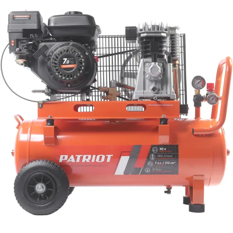 Компрессор воздушный масляный PATRIOT KGA 360 L50 бензиновый поршневой ременной используется там, где нет доступа к электросети. Для мобильных работ с пневмоинструментами и выполнения различных строительных, ремонтных и окрасочных задач. Имеет быстросъемный штуцер (_") и «елочку» с вентилем.