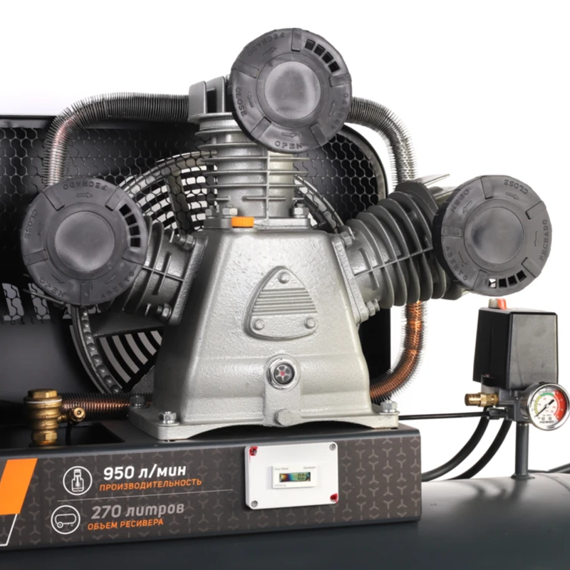 Профессиональный компрессор масляный для пневмоинструмента на сервисных, ремонтных и прочих работах, небольших производствах, в сферах услуг. Производительности 950 л/мин (57 м3/ч) достаточно для пескоструйных, монтажных и строительных работ. При подключении подходящего пневмоинструмента, справится с такими задачами, как продувка труднодоступных мест, подкачка шин, нанесение смазочных материалов. Два быстросъемных штуцера (_") и кран с вентилем для подключения пневмоинструмента. Объем ресивера — 270 л. Работает от напряжения 400 В, предназначен для использования в трёхфазной сети.