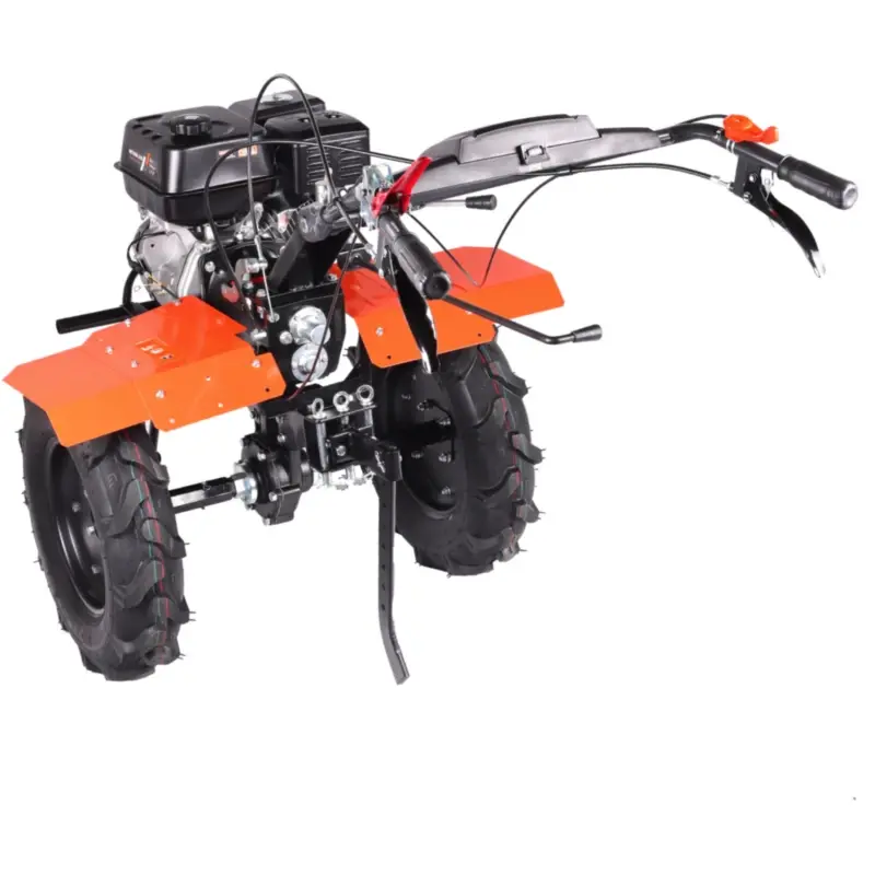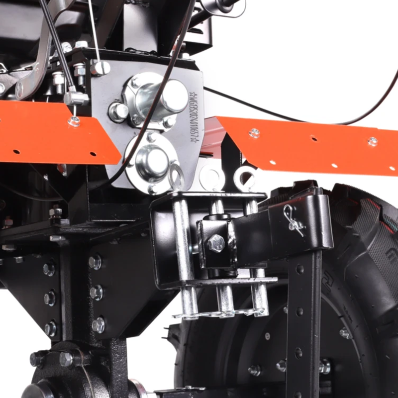 Крепкие ручки и усиленная рама делают мотоблок подходящим для тяжелых задач. Руль оснащен кнопкой включения, рукояткой газа, рычагами привода и кейсом для инструментов, его наклон регулируется. Металлическая подножка с ручкой упрощает установку фрез. Мотоблок перемещается на колесах типа P5,00-12D-1 с рельефным протектором, обеспечивающим надежное сцепление с грунтом.