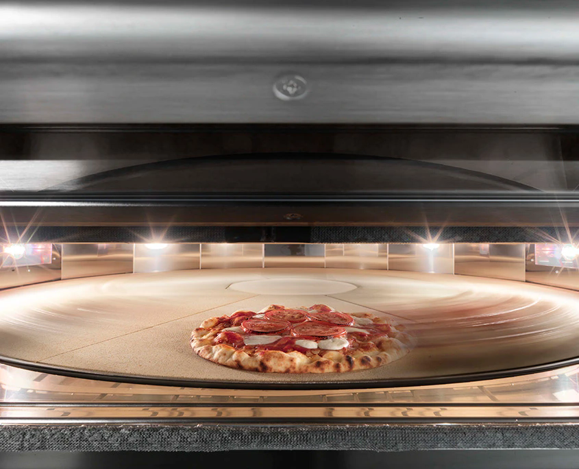 Поверхность для выпечки из кордиеритового кирпича установлена на вращающуюся раму