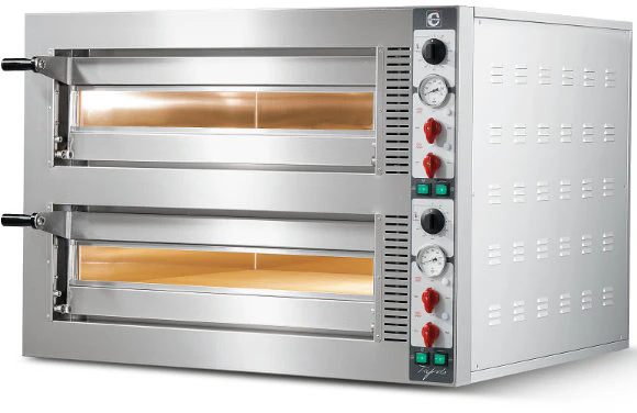 Печь для пиццы Cuppone TP935/2CM с передней панелью и камерой выпечки из нержавеющей стали предназначена для приготовления пиццы и различных закусок, таких как, сэндвичи, куриные стрипсы и т.д. на предприятиях общественного питания.