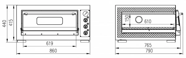 Каменный под и возможность регулировки температуры нижней и верхней поверхностей позволяют максимально равномерно распределить тепло внутри печи и доводить пиццу до полной готовности в течение 3-5 минут.