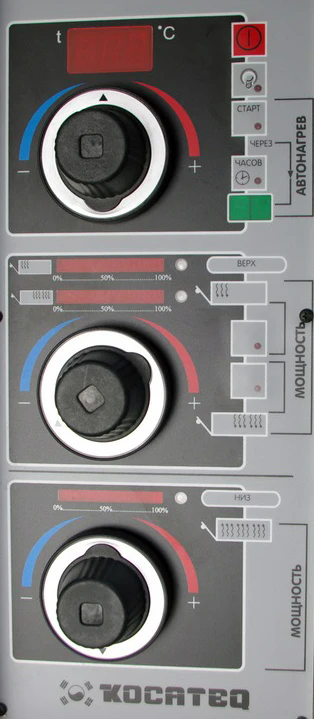 Электро-механическая панель управления: кнопка включения-выключения, кнопка включения подсветки, термостат до 350 градусов Цельсия с цифровым дисплеем, раздельная регулировка мощности верхних и нижних ТЭНов, раздельное включение и регулировка верхних левых и правых ТЭНов;