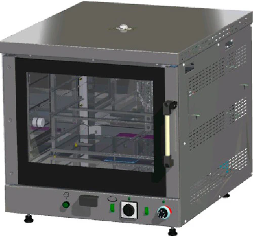 В течение процесса приготовления, клеть с противнями вращается в тепловой камере, обеспечивая более равномерную тепловую обработку продуктов и исключая необходимость ручного переворота противней.