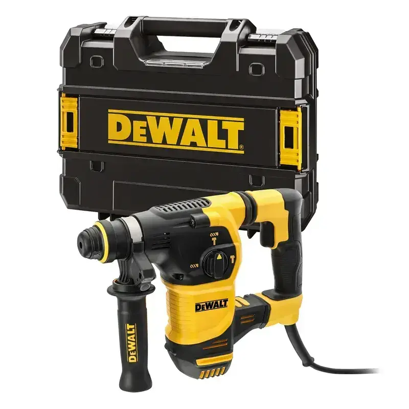 Перфоратор DeWalt D25334K обладает мощностью 950 Вт. Сила удара составляет 3,5 Дж, что позволяет работать с бетоном, металлом, деревом. Инструмент поставляется упакованным в кейс, в комплекте с дополнительным держателем и ограничителем глубины.