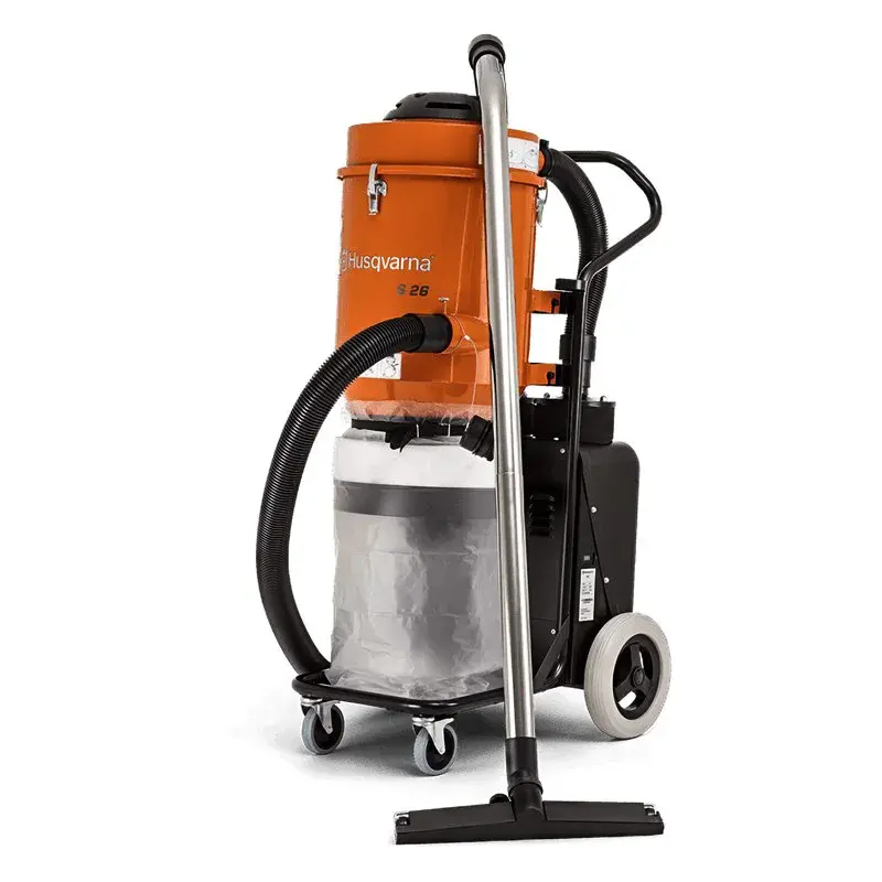Строительный пылесос Husqvarna S26 - мощный строительный пылесос с одноконтурной системой удаления пыли для работ сухом и влажном режиме. Система сбора - мешки Longopac. Оснащен однофазным электродвигателем 220 В, мощностью 2,4 кВт, с отдельной системой охлаждения и поэтому может непрерывно работать в течение всего дня. Отлично подходит для сбора сухого мусора, стружки, строительных отходов, водяного шлама при алмазном бурении и шлифовании бетона. Оснащен надежным сертифицированным фильтром HEPA H13 и массивным конусообразным фильтром предварительной очистки. Система очистки конического главного фильтра Jet Pulse обеспечивает стабильный сбор пыли в течение всего рабочего дня.