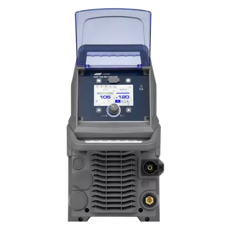 Аппарат для промышленной воздушно-плазменной резки металлов — ПТК HANKER CUT 105 MV LCD H85. Аппарат оснащен инверторной схемой на базе IGBT транзисторов с широтно-импульсной модуляцией (PWM). Это обеспечивает стабильную работу при продолжительных нагрузках и высокую производительность при резке металлов различной толщины. Помимо этого, имеет встроенный модуль PFC для стабилизации напряжения и коррекции коэффициента мощности, за счет чего аппарат подстраивается под питание от слабой сети и сглаживает перепады напряжения. Аппарат подключается к сети 220/380 В. Как корректно подключить аппарат к сети смотрите в руководстве по эксплуатации.
