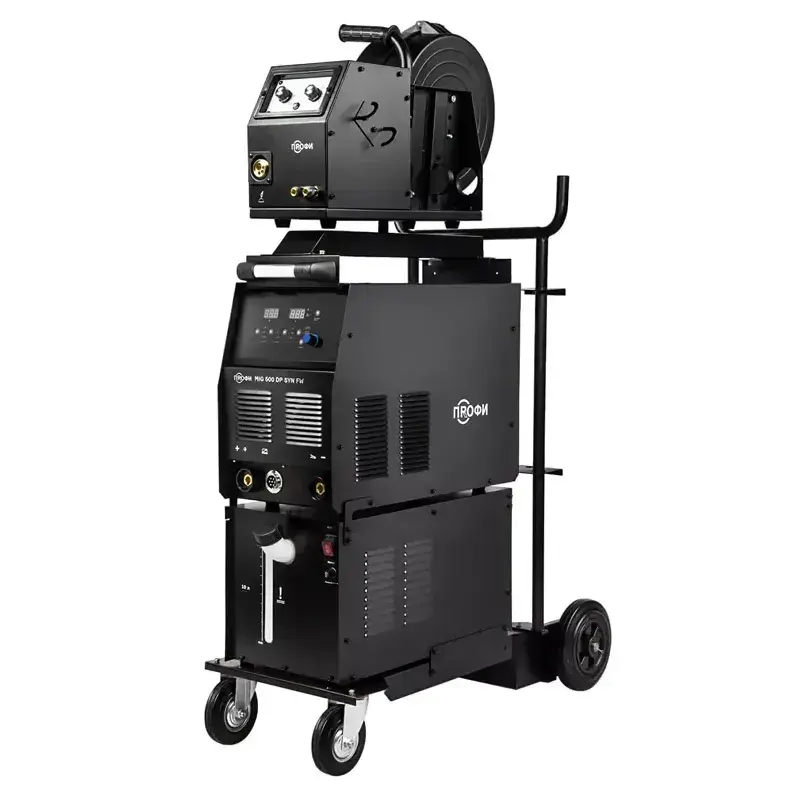 Полуавтомат ПРОФИ MIG 500 DP SYN FW поставляется с блоком водяного охлаждения объемом до 10 литров и с тележкой-платформой, для легкого и комфортного перемещения и эксплуатацию оборудования. Тележка оснащена надежной усиленной конструкцией. На нее можно установить сварочный источник, выносной подающий механизм, блок жидкостного охлаждения и газовый баллон объемом 40 литров.