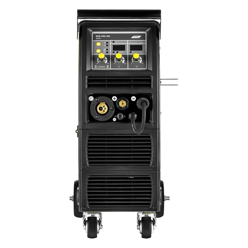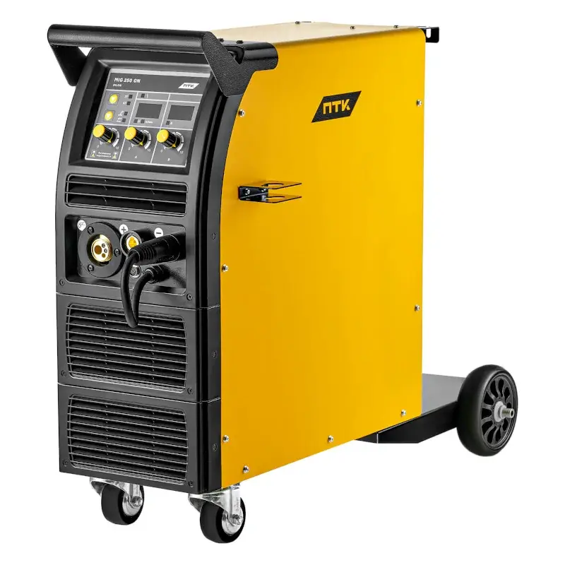 ПТК RILON MIG 250 GN – это обновленная линейка аппаратов для полуавтоматической сварки, которая производится на заводе RILAND. В аппаратах применяются усовершенствованные инверторные технологии. Принцип работы заключается в преобразовании переменного тока частотой 50Гц в постоянный ток и далее в ток высокой частоты (33 кГц), посредством мощных IGBT транзисторов, а затем выполняется преобразование высокого напряжения в высокий ток. Выходная мощность источника регулируется при помощи ШИМ (широтно-импульсной модуляции сигнала). Аппарат работает от трехфазной питающей сети в диапазоне ±15% без снижения характеристик.