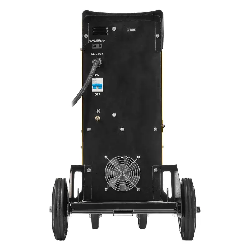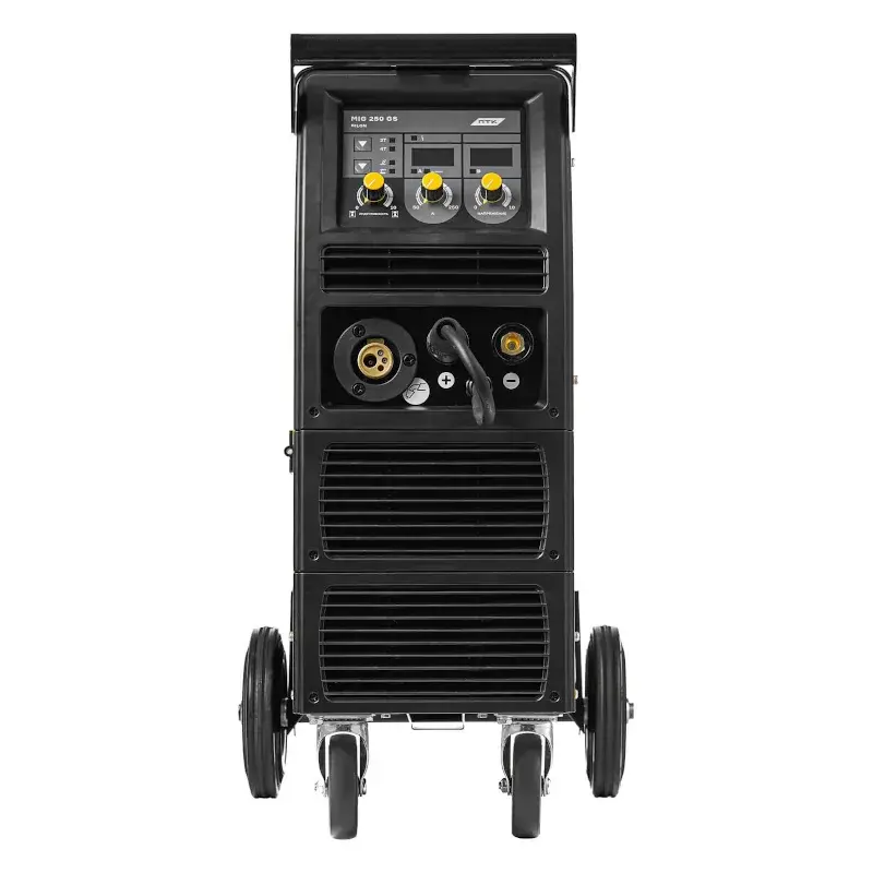 - На передней панели аппарата находится многофункциональный дисплей с возможностью регулировок силы сварочного тока, сварочного напряжения, индуктивности, регулировки скорости подачи проволоки и других параметров сварочного процесса.