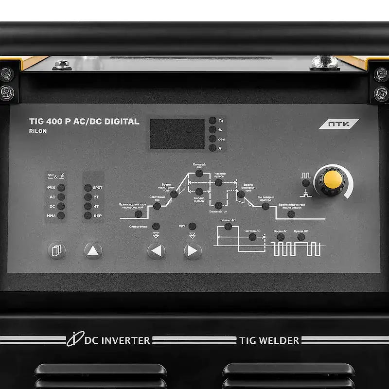 Аппарат аргонно-дуговой сварки ПТК RILON TIG 400 P AC/DC DIGITAL предназначен для промышленного использования, сварки неплавящимся вольфрамовым электродом при постоянном токе (DС) таких металлов как: сталь, никель, медь и их сплавы. Сварка алюминия и его сплавов производится на переменном токе (AC).