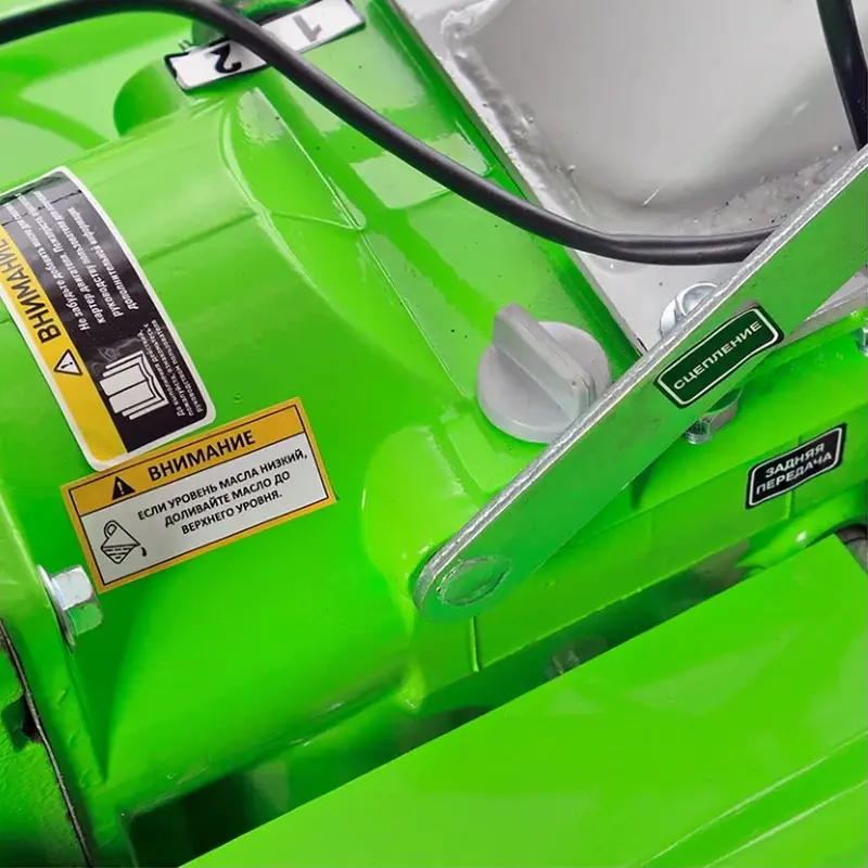 Мощный шестерёнчатый редуктор в чугунном корпусе способен выдержать серьезные нагрузки при работе с тяжёлыми почвами.