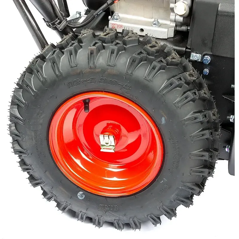 Благодаря мощному мотору снегоочиститель без затруднений за один проход освобождает от снега полосу шириной в 66см. Легко справляется с сугробами высотой до 54см. Запуск двигателя осуществляется электростартером, питающимся от электросети 220 вольт. Шины на колесах имеют агрессивный и глубокий протектор для снижения возможной пробуксовки при уборке больших сугробов из слежавшегося или плотного снега.