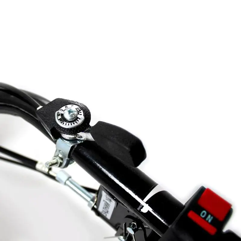 Мягкие прорезиненные рукоятки создают удобный и надежный ухват инструмента. На них размещены основные органы управления: замок зажигания, рычаги газа и переключения скоростей. Металлический щиток, расположенный над колесами, защищает вас от откидываемых камней и грязи.
