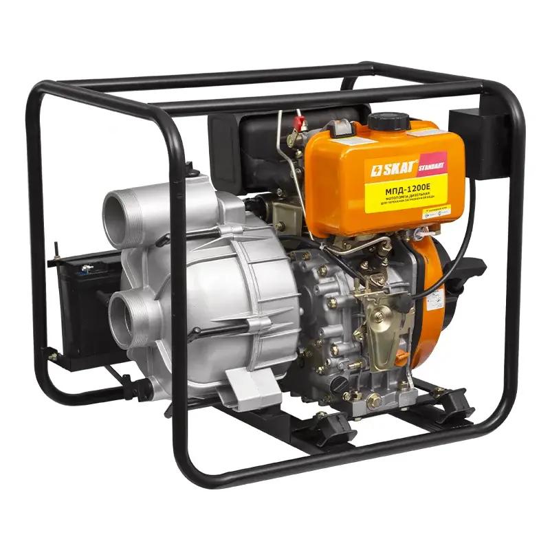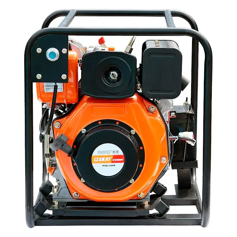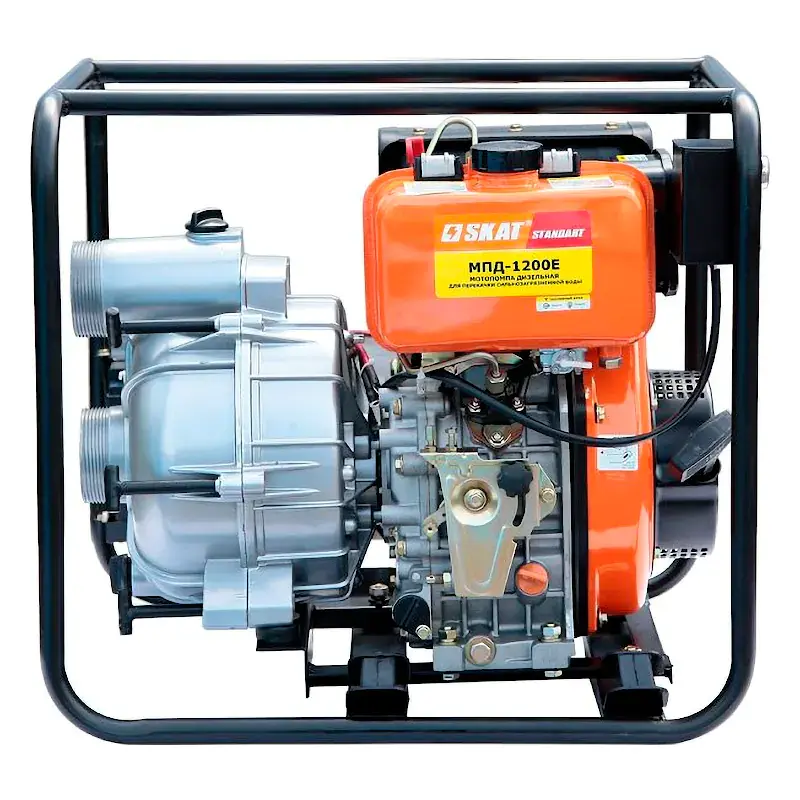 Грязевая мотопомпа СКАТ МПД-1200Е предназначена для загрязнённых жидкостей, в которых содержатся частицы песка, листьев и других примесей размером до 25 мм.