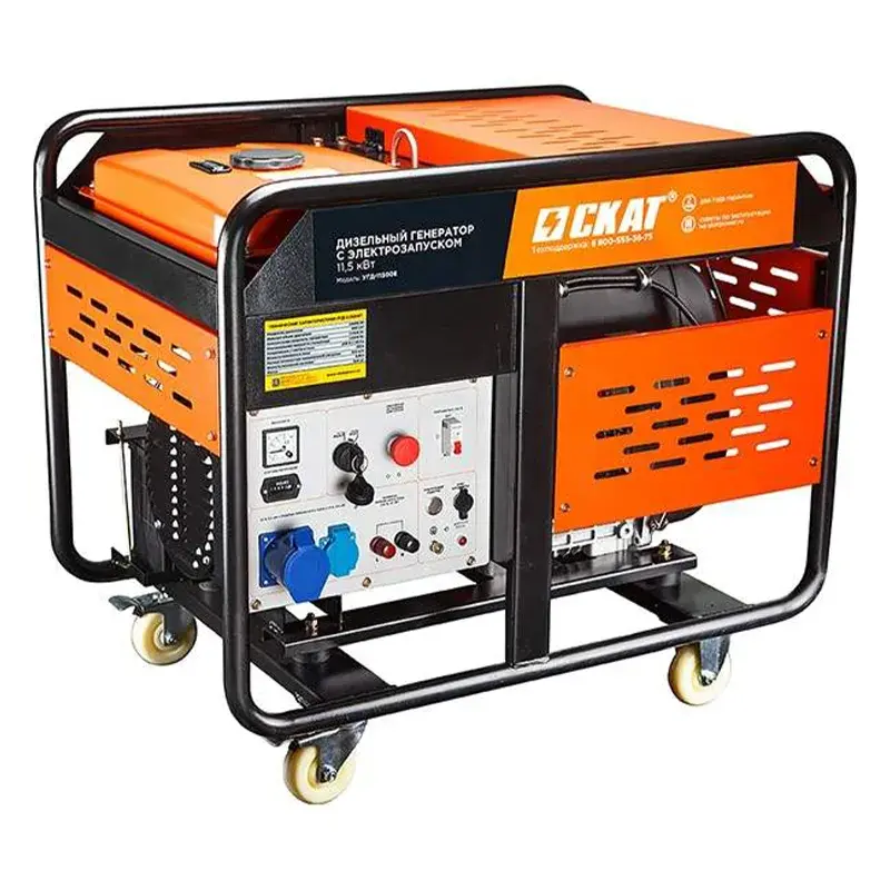 Однофазный дизельный генератор СКАТ УГД-11500E мощностью 11,5 кВт обеспечит электроэнергией дачу, коттедж, строительную площадку или даже небольшой цех и станет отличным помощником горнопромышленникам, лесозаготовителям, аварийным, монтажным бригадам.