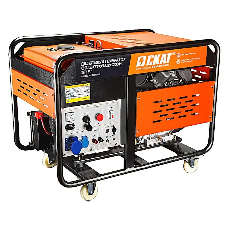 Однофазный дизельный генератор СКАТ УГД-15000E мощностью 15 кВт обеспечит электроэнергией дом, строительную площадку, цех, производственный участок, рефконтейнер, небольшой вахтовый поселок, придорожное кафе.