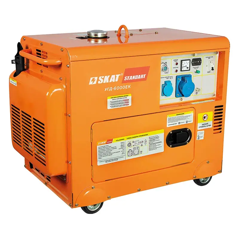 Дизельный генератор СКАТ УГД-6000ЕК в кожухе мощностью 6 кВт обеспечит энергией дачу, коттедж, строительную площадку или торговую точку и станет отличным помощником дорожным рабочим.