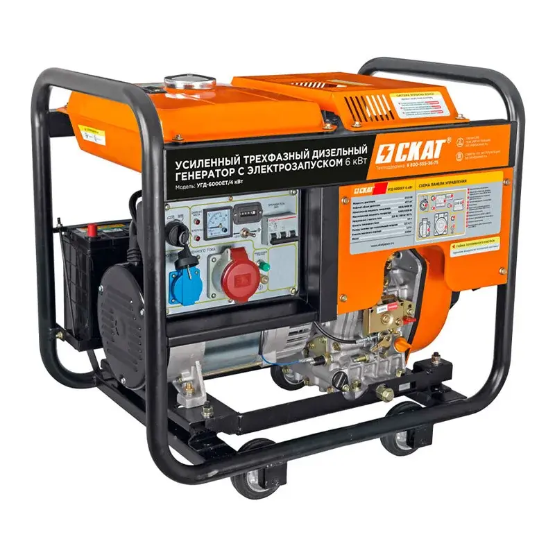 Трехфазный дизельный генератор СКАТ УГД-6000ЕТ мощностью 6 кВт на 380 вольт и 4 кВт на 220 вольт обеспечит энергией строительную площадку и станет отличным помощником для горнопромышленников, аварийных и монтажных бригад.