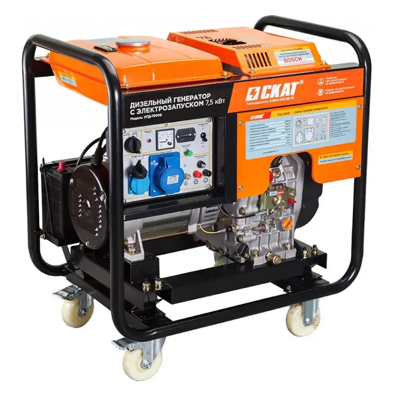Дизельный генератор СКАТ УГД-7500Е мощностью 7,5 кВт обеспечит энергией строительную площадку и станет отличным помощником лесозаготовителям, геологам, ремонтным бригадам.
