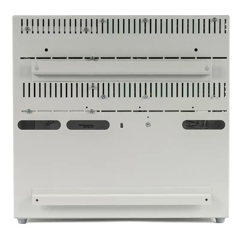 В ИБП без аккумулятора рекомендуется установить две батареи 12 В емкостью 40 Ач, приобретаемые отдельно. Прибор автоматически переходит к резервному питанию нагрузки при понижении напряжения электрической сети и его полном отсутствии. Светодиодные индикаторы на корпусе сигнализируют о режимах работы: от сети или АКБ.