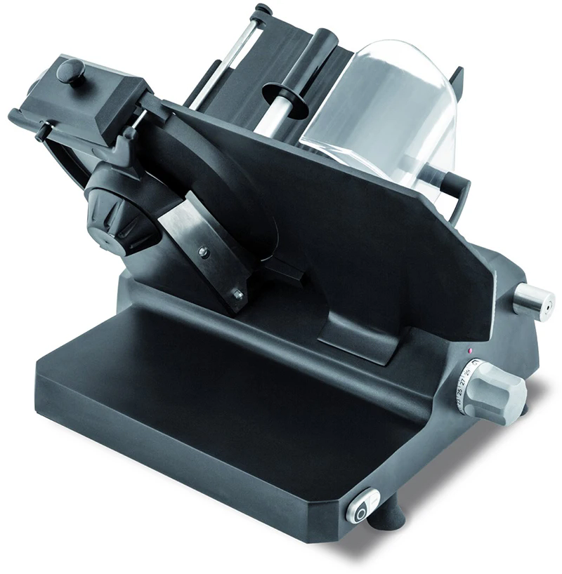 Работа на слайсере требует меньших усилий, более аккуратная нарезка, очень быстрая очистка.