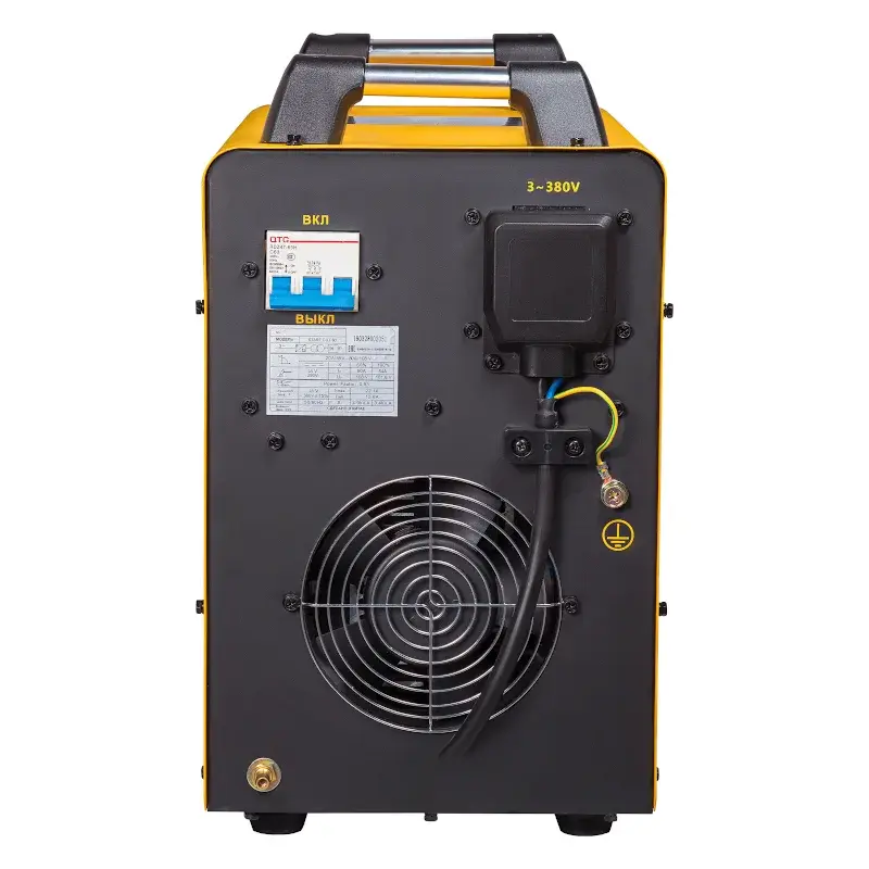 Передняя панель оснащена цифровым табло для отображения выбранных значений, регуляторами мощности и времени продувки. Переключатель режимов работы плазмотрона позволяет выбрать удобный способ резки в зависимости от свойств материала и рабочих условий. Светодиодные индикаторы предупреждают о перегреве и наличии напряжения.