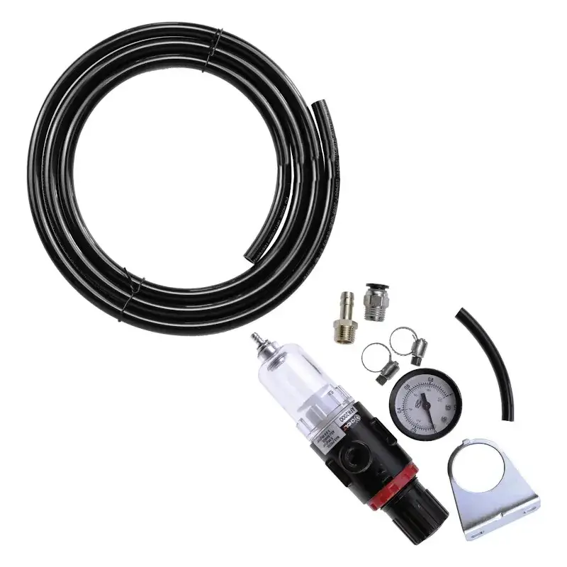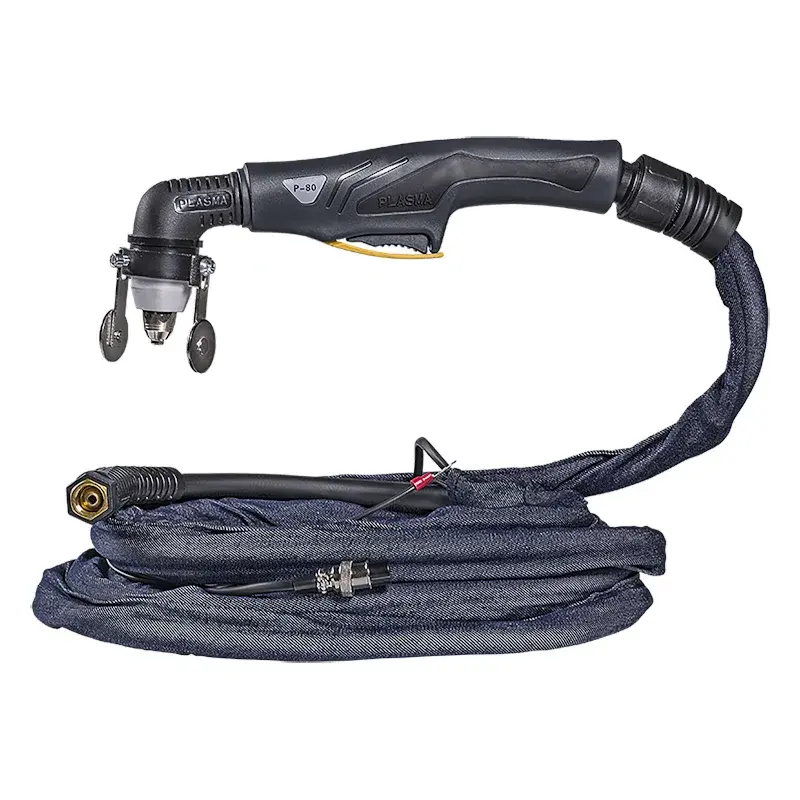 Для функционирования плазмореза требуется подача сжатого воздуха от компрессора. Манометр на воздушном шланге устройства позволяет точно установить необходимый уровень рабочего давления. В комплект поставки входит плазмотрон Р-80 с бесконтактным возбуждением плазменной дуги и удобным кнопочным управлением.