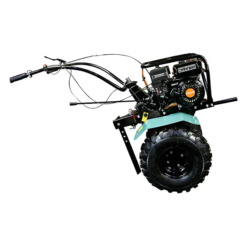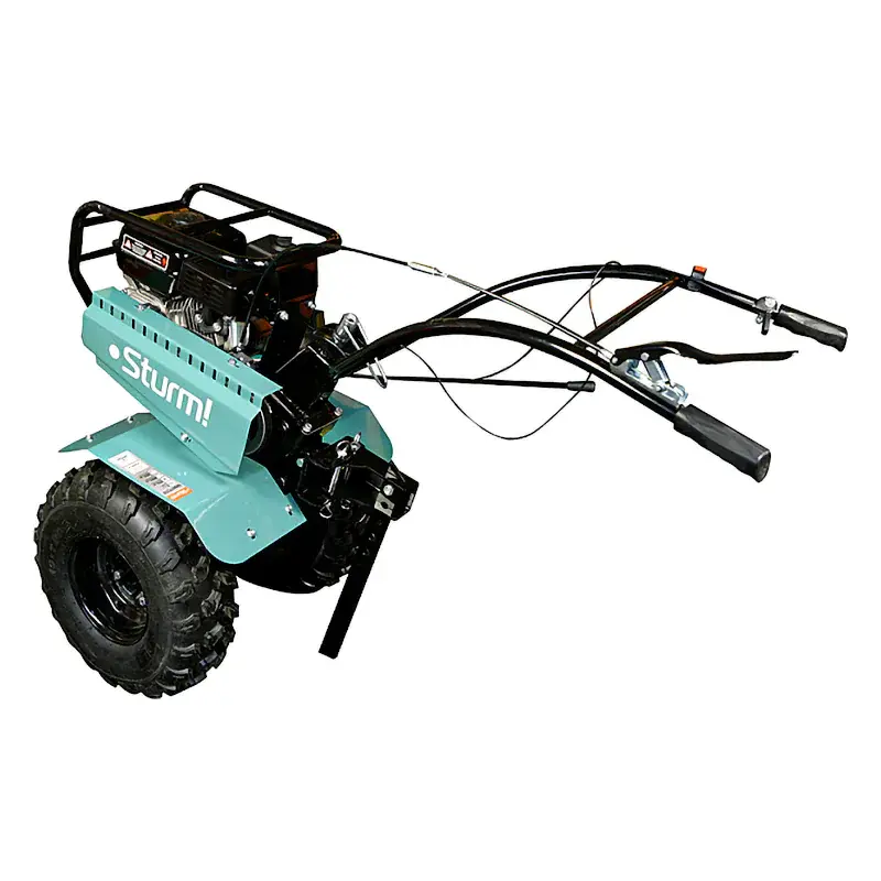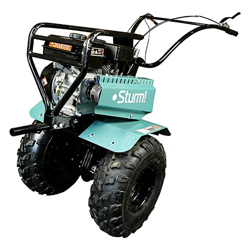 Мотоблок бензиновый Sturm! GK847CI19 — 3-х скоростная модель (понижающая, основная и повышающая) с чугунным редуктором и формованными крыльями, на внушительных колесах 19*7-8. Удобный руль с регулировкой вверх-вниз/влево-вправо.