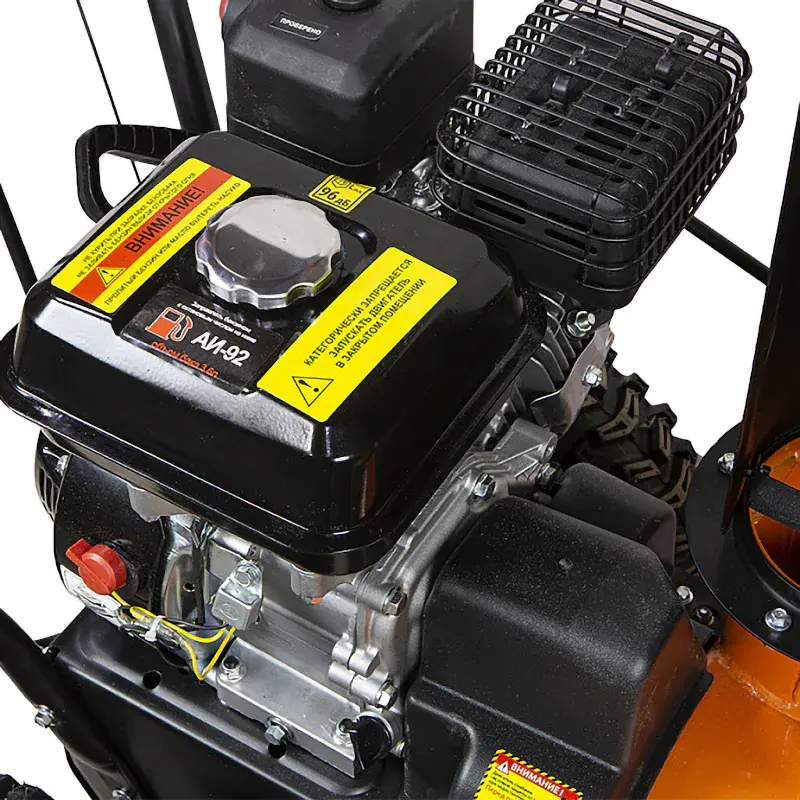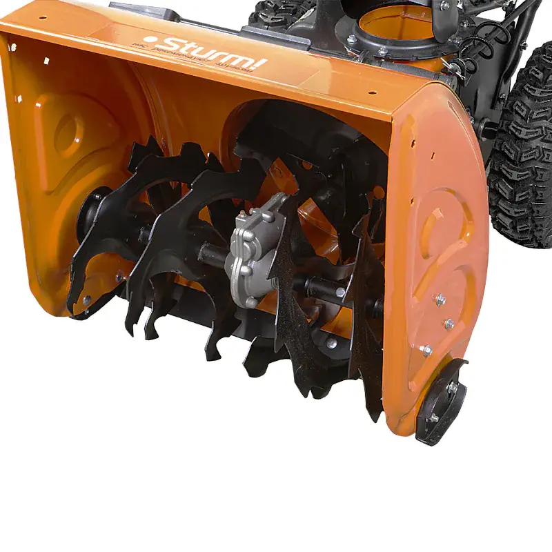 Зазубренный шнек первой ступени успешно измельчает слежавшийся снег и может справиться даже с настом толщиной до 2 см. Высокооборотистая вторая ступень снегоуборочного агрегата отбрасывает снег на расстояние до 12 м.