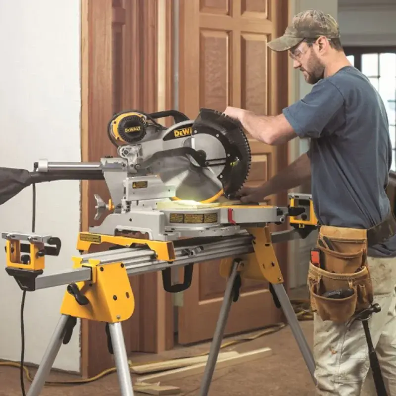 В торцевой пиле DeWALT DWS780 есть запоры угла наклона профилей. Они облегчают горизонтальный рез карнизов, плинтусов или багетов.