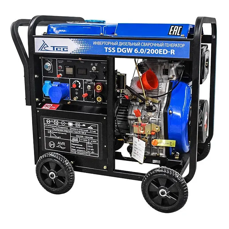 Сварочный дизельный генератор TSS DGW 6.0/200ED-R — предназначен для проведения профессиональной Ручной Дуговой Сварки и питания электропотребителей в условиях отсутствия стационарной сети электроснабжения.