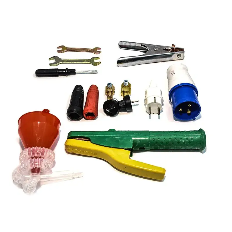 - Быстроразъемные соединения сварочных кабелей такого же типа, как на сварочных источниках работающих от сети, позволяют подключать кабель сечением до 70мм.