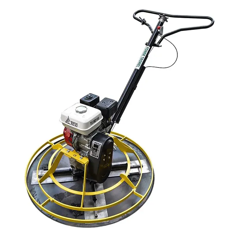 Бензиновая затирочная машина приводится в действие четырехтактным одноцилиндровым двигателем мощностью 5,5 л.с. с воздушным охлаждением. К заглаживанию приступают после того, как бетон выровнен, уплотнен виброрейкой и схватился до степени достаточной, чтобы выдержать вес машины. На первом этапе производится грубая обработка с помощью диска, затем — заглаживание затирочными ножами.