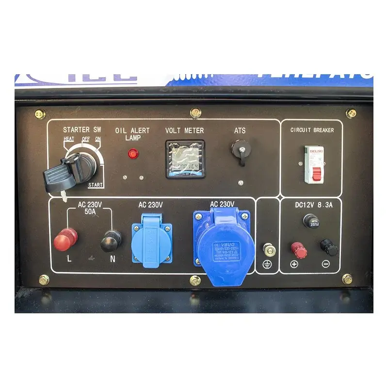 - Панель управления содержит вольтметр для отображения напряжения, счетчик моточасов, а также, индикатор уровня масла и индикатор топлива, автомат защиты.