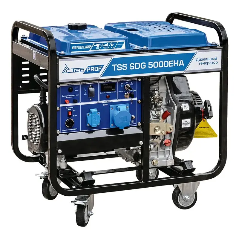 Дизельный генератор TSS SDG 5000EHA - автономная электростанция с максимальной мощностью 5,5 кВт. Предназначен для питания однофазных электроприборов с суммарным потреблением энергии в 5 кВт. Благодаря колесам для транспортировки подойдет для использования на предприятиях, дома или на даче в качестве основного или резервного источника электричества.
