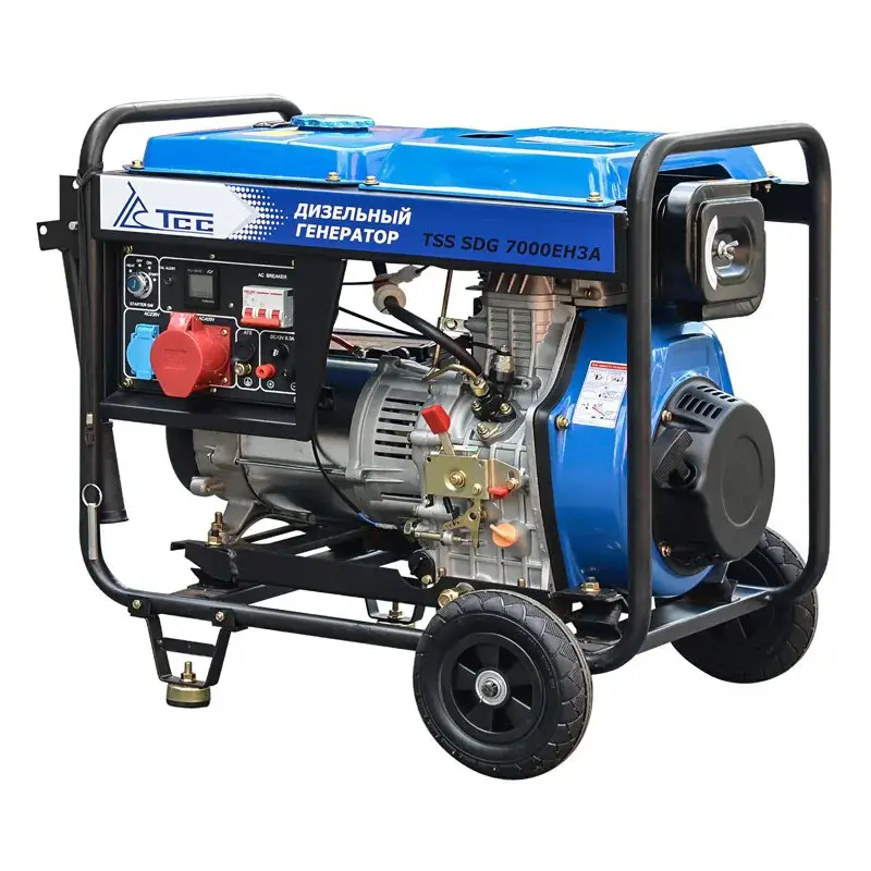 Дизельный генератор с электростартом TSS SDG 7000EH3A предназначен для выработки электроэнергии с основными характеристиками: напряжение -380/ 220 вольт, частота 50 Гц и номинальной мощностью 6.5 кВт, оснащенный колесным комплектом и ручкой, для удобства передвижения.