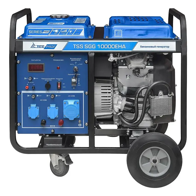 Бензогенератор TSS SGG 10000EHA на четырех колесах способен питать однофазное оборудование мощностью до 10 кВт. Модель отлично подходит для использования как в качестве запасного источника питания, так и основного.