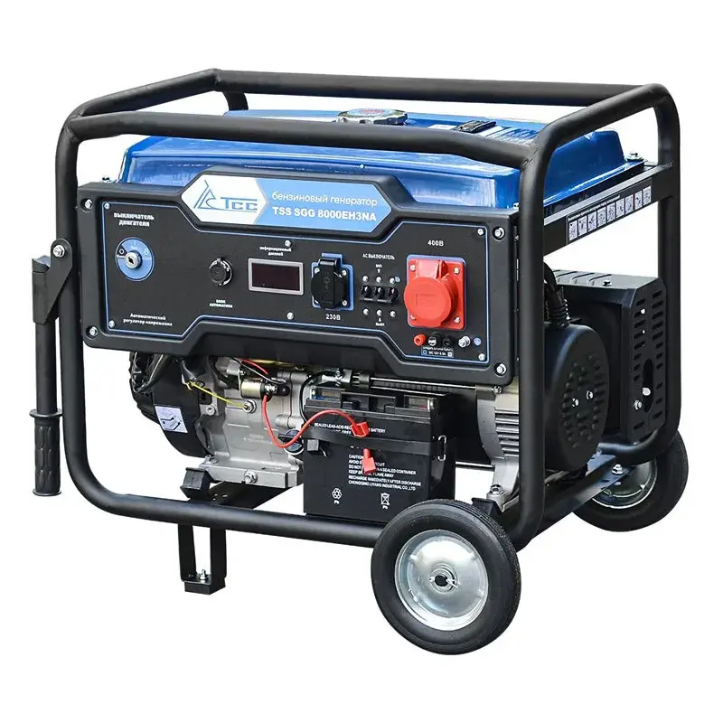 Бензогенератор TSS SGG 8000EH3NA обладает номинальной мощностью 7,8 кВт и способен питать как однофазные, так и трехфазные потребители. Для удобного перемещения модели по рабочей площадке есть два транспортировочных колеса, а также складная ручка.