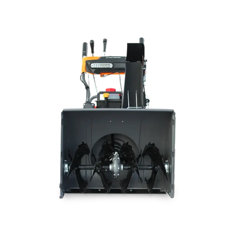 Шнек изготовлен из металла. Он отлично справляется с любым типом снега, даже с обледеневшим. Высота ковша регулируется при помощи направляющих лыж по бокам. Вы можете приподнять ковш при очистке неровного участка или опустить к земле для захвата максимального количества снега с асфальтированной поверхности. Поскольку зимой короткий световой день, светодиодная подсветка делает работу более удобной и безопасной.