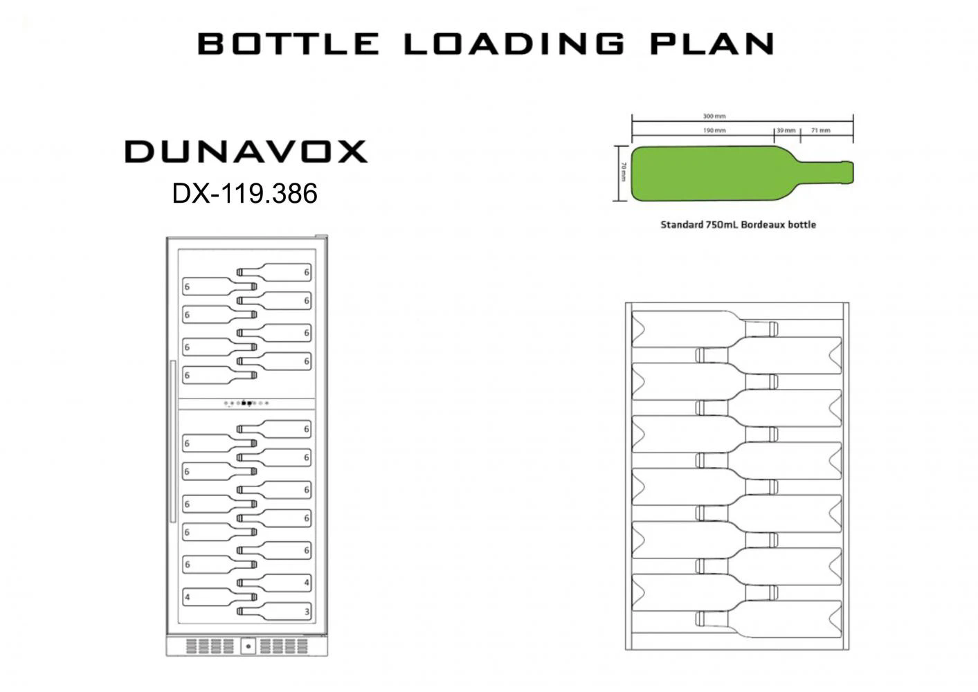 Довольно вместительный винный шкаф, который прекрасно подойдет как для использования его в ресторанах или кафе, так и для установки его дома. Вы можете с легкостью разместить внутри DX-119.386DSS до 119 бутылок вина типа Бордо, объем каждой из которых будет не более 0,75 л. Работа холодильной установки осуществляется за счет специального малошумного компрессора, а это значит, что Вас не потревожат никакие посторонние шумы. По типу расположения шкаф может быть использован как встраиваемый, так и как отдельностоящий, в зависимости от Ваших предпочтений. Dunavox DX-119.386DSS имеет разделение на две независимые температурные зоны. Температура каждой из них может настраиваться в зависимости от необходимости в следующих пределах: верхняя зона от +5 ° C до +10 ° C, нижняя зона от +10 ° C до +18 ° C. В двери имеется специальный замок.