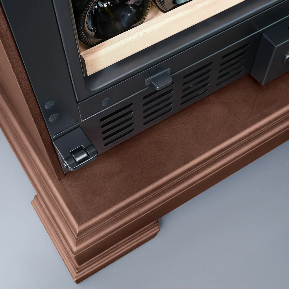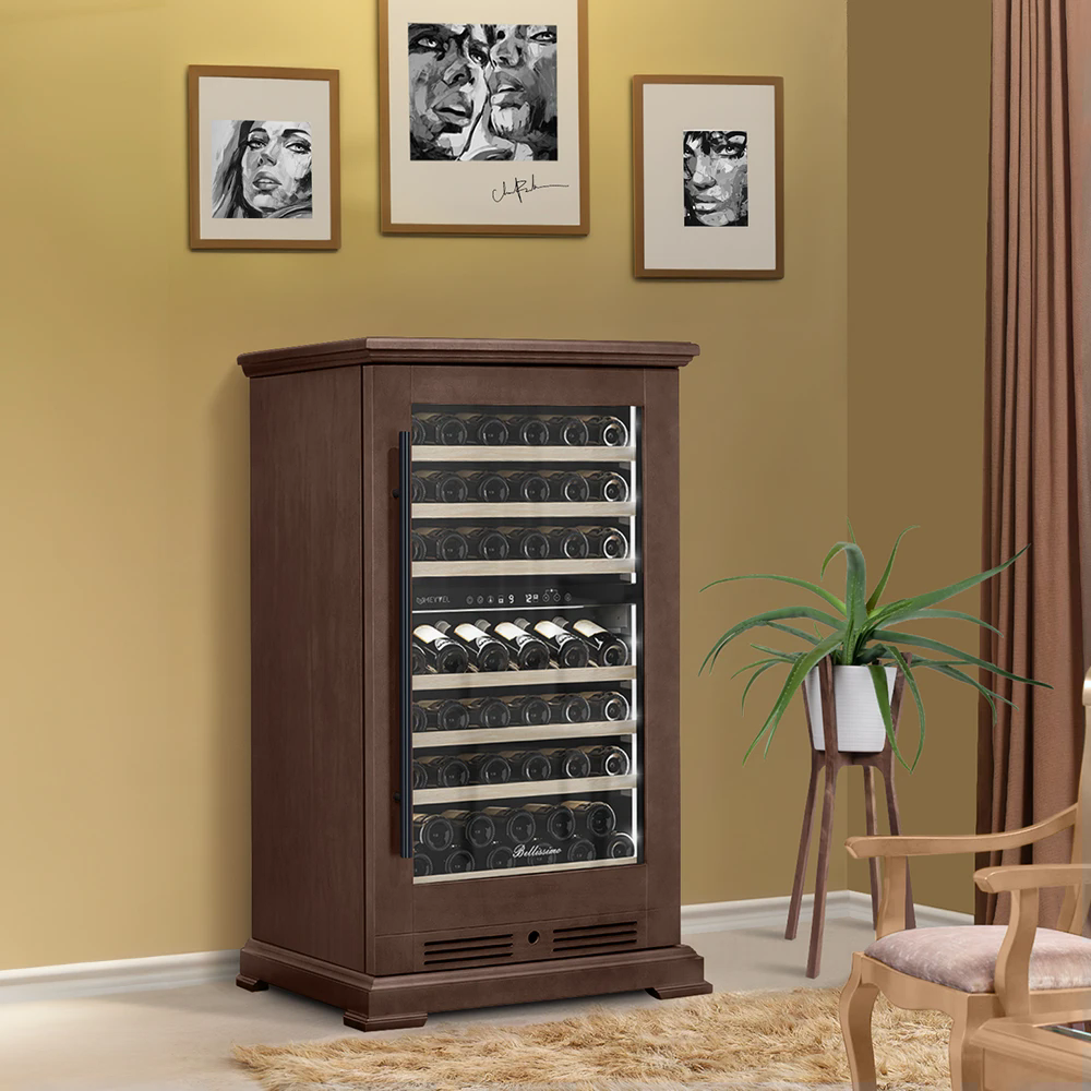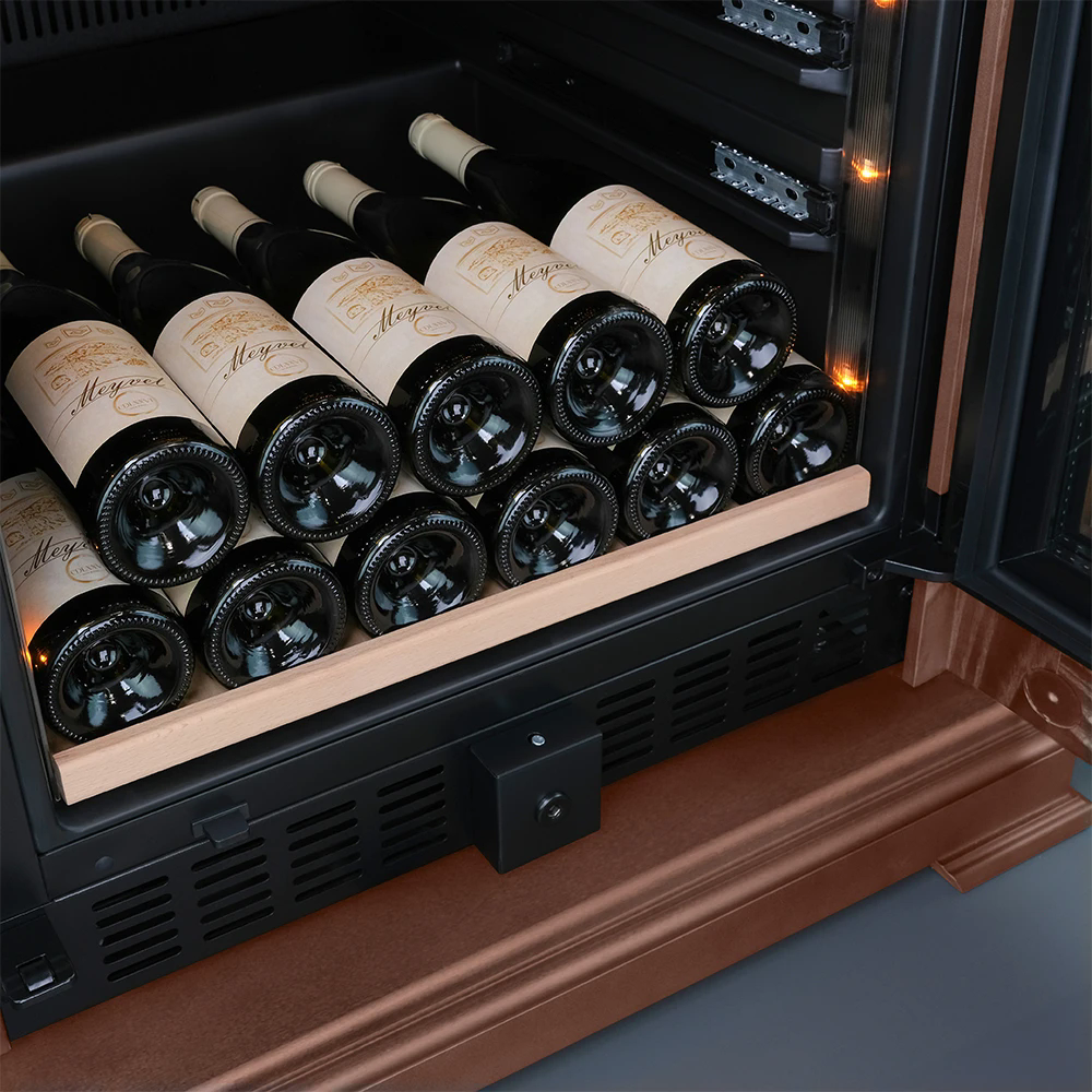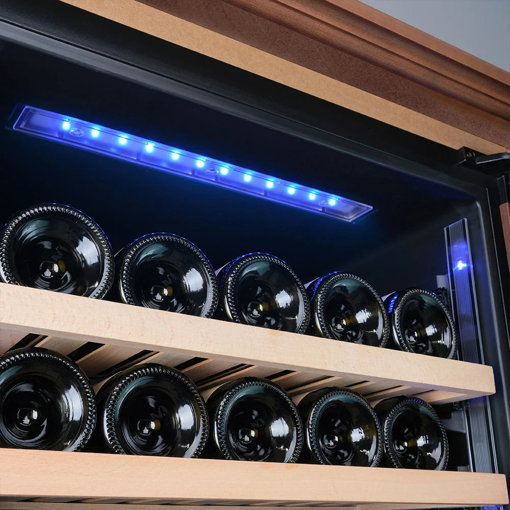 Винный холодильник оснащен дверью с защитой от ультрафиолетовых лучей и отлично подойдет для хранения и созревания различных сортов вин. Динамическая система охлаждения обеспечивает оптимальную температуру для вина и сохраняет необходимую влажность внутри камеры.