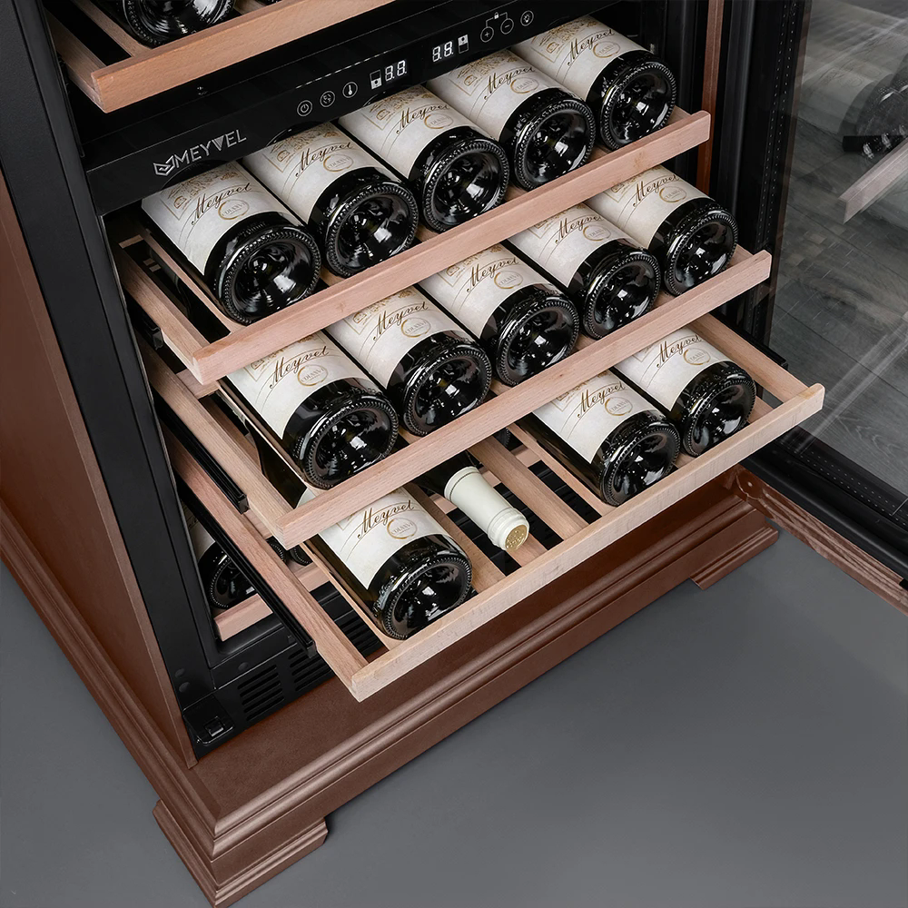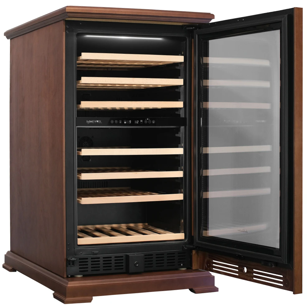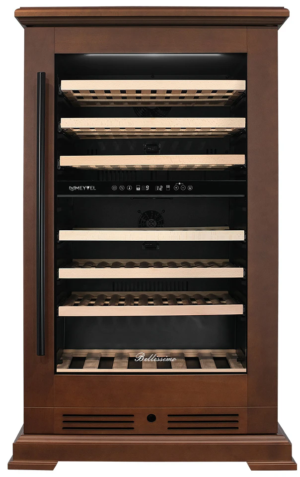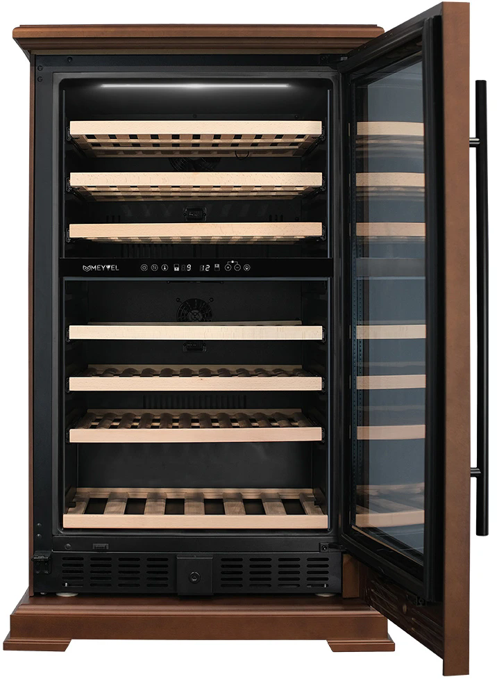 Винный шкаф двухзонный Meyvel MV77PRO-KBT2 (Итальянский орех) имеет привлекательный внешний вид, сочетающий в себе неподвластное времени очарование натурального дерева с высокотехнологичными системами.