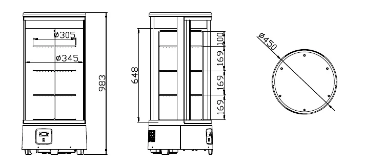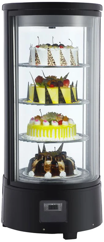 Витрина оснащена замком, регулятором температуры, LED-подсветкой и четырьмя вращающимися хромированными полками.