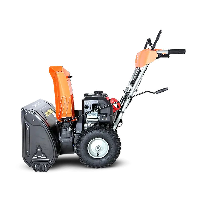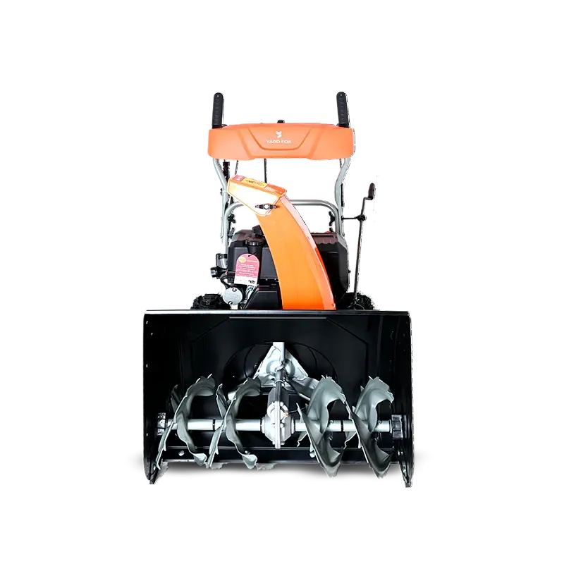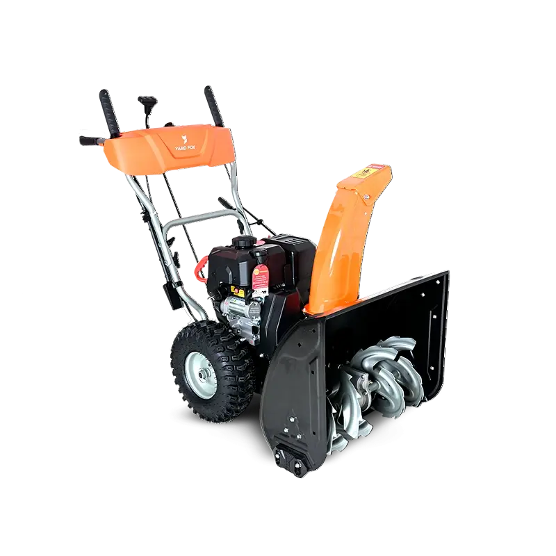 Зимний двигатель рассчитан на легкий запуск в морозную погоду. Рычаги, рукоятки и прочие элементы управления бензинового снегоуборщика YARD FOX удобно расположены под руками. Разгрузочный желоб можно поворачивать в диапазоне 180_ с помощью длинного рычага. Регулировка выполняется на ходу, без остановки машины. Переключатель скоростей позволяет выбрать комфортный темп перемещения в зависимости от условий уборки. Дальность выброса легко изменяется путем наклона козырька.