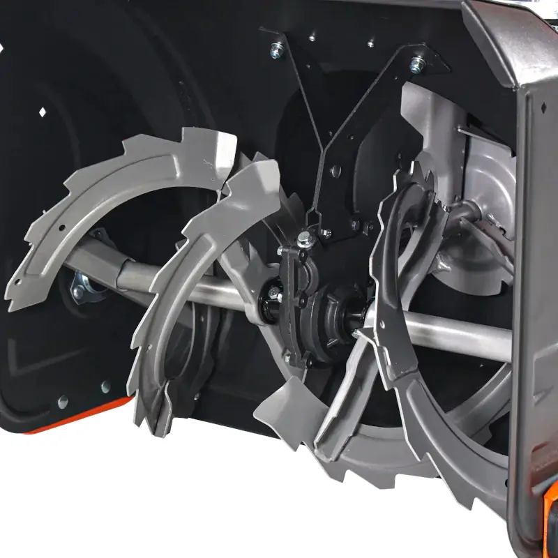 Ковш шириной 66 см и высотой 54 см позволяет убирать даже высокие сугробы, а двухступенчатая система шнеков отбрасывает снеговые массы на расстояние до 15 м. Ковш, шнек и желоб выполнены из прочной стали, благодаря чему устойчивы к повреждениям и высоким нагрузкам.