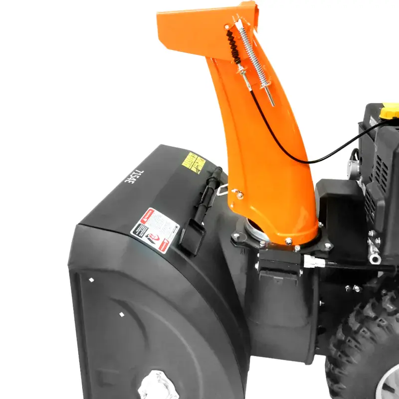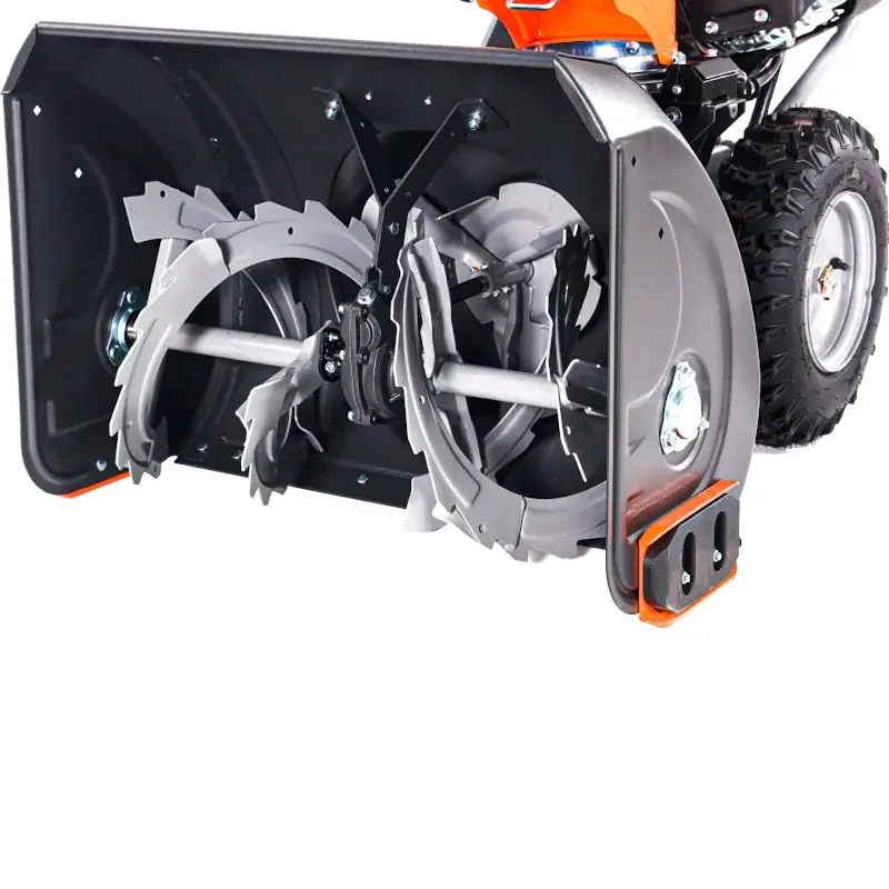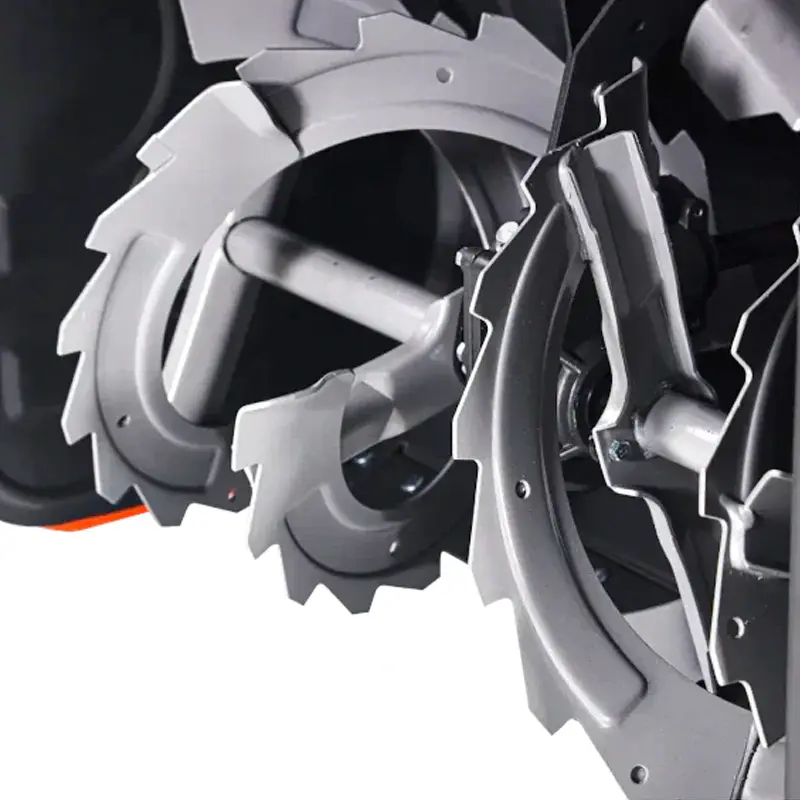 Эффективную и качественную уборку снега обеспечивает двухступенчатая система шнеков. Зубчатый шнек загребает и перемалывает снежную массу в крошку, которая затем выбрасывается с помощью крыльчатки через желоб. Расстояние выброса достигает 11 метров, а направление регулируется на угол до 180°.