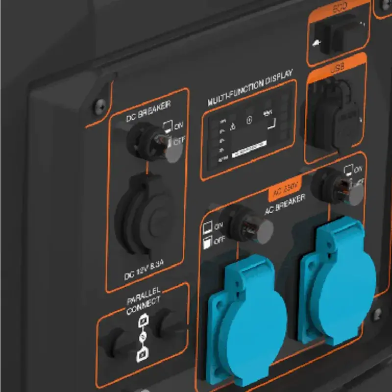 На панели управления размещены розетки на 220 В для подключения бытовых приборов или электроинструмента. Для защиты от пыли и грязи во время хранения они оснащены крышками. Помимо этого, рядом расположен выход на 12 В, который используется для подзарядки автомобильного аккумулятора.