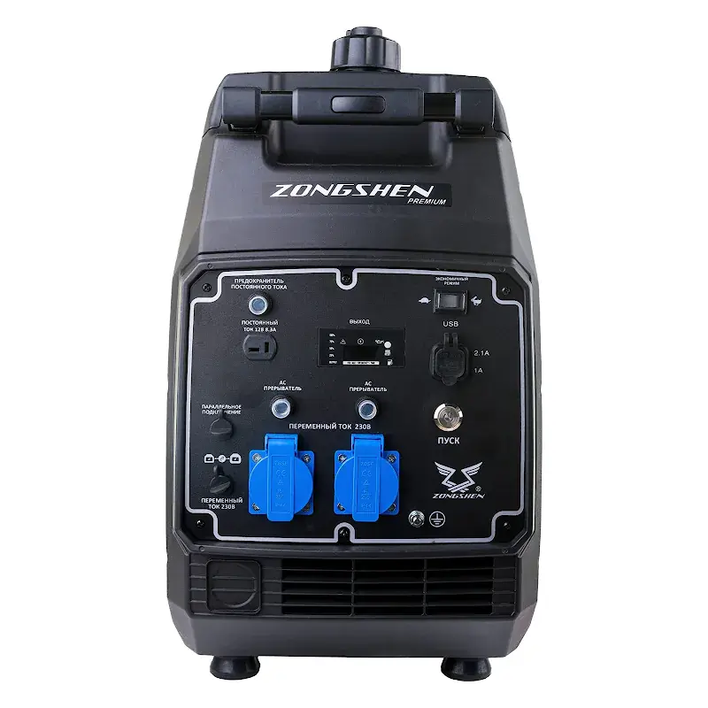 Благодаря электростартеру запуск бензинового генератора осуществляется поворотом рукоятки на корпусе. Потребителей можно подключить к розетке на 220 В переменного тока. Выход 12 В постоянного тока позволяет подзарядить автомобильный аккумулятор. На цифровой информационной панели отображается вся необходимая информация, такая как напряжение, моточасы, частота, мощность и уровень топлива. Цветные индикаторы обеспечивают удобство эксплуатации и обслуживания устройства. Зеленый светодиод сигнализирует о работе в штатном режиме, красный — о перегрузке, желтый — о низком уровне масла. Для увеличения выходной мощности электростанции предусмотрены клеммы параллельного подключения еще одного такого же генератора.